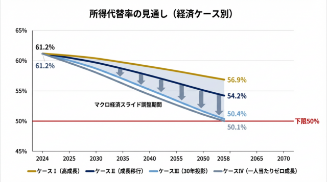 令和6年財政検証では、経済前提の異なる4つのケースで所得代替率の見通しが示されました。いずれのケースでも、マクロ経済スライドの調整が終了する時点で所得代替率が決まります。