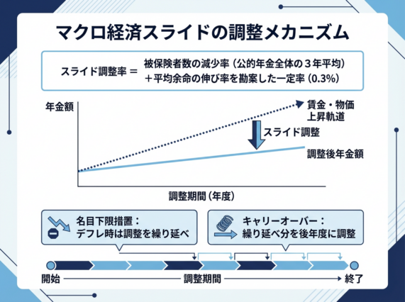 ただし、名目下限措置により、年金額が前年度を下回らないようにする規定があります。デフレ時には調整が繰り延べられ、後年のインフレ時に「キャリーオーバー」として調整されます。